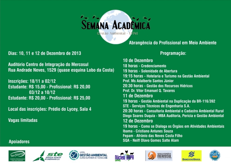 De 10 a 12 de dezembro, o curso superior de Tecnologia em Gestão Ambiental da Universidade Federal de Pelotas (UFPel) realiza a sua terceira semana acadêmica promovida pelo Diretório Acadêmico (D.A.). O evento terá o apoio da Gestão Ambiental da duplicação da BR-116/392, gerenciada via licitação pública pela empresa Serviços Técnicos de Engenharia S.A. (STE). O empreendimento é de responsabilidade do Departamento Nacional de Infraestrutura de Transportes (DNIT).