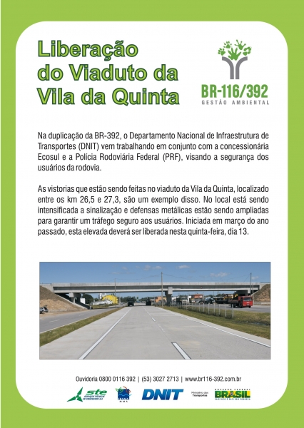Desde o início da duplicação, o DNIT reúne-se com representantes da Vila da Quinta para ouvir as demandas dos moradores e esclarecer dúvidas sobre o empreendimento. As obras nesta localidade já estão concluídas e por motivos de segurança a liberação da última elevada, iniciada em março de 2013, foi prorrogada. A autarquia, a Ecosul e a Polícia Rodoviária Federal (PRF) trabalham em conjunto para que o viaduto fique seguro tanto para veículos quanto para pedestres e ciclistas. Uma nova vistoria será realizada amanhã (13/03), às 10h, com a presença do diretor de infraestrutura rodoviária do órgão, Roger Pêgas.