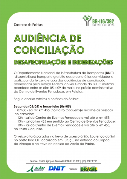 Inicia nesta segunda-feira (05/05), o terceiro mutirão de conciliação com proprietários que terão suas terras e benfeitorias desapropriadas em decorrência das obras de duplicação da BR-392 e BR-116, no trecho que compreende as cidades de Pelotas, Turuçu e São Lourenço do Sul. As conciliações acontecem até o dia 09 de maio, das 9h às 12h e das 14h às 18h, no auditório da administração do Centro de Eventos Fenadoce, em Pelotas. Transporte gratuito será disponibilizado pelo Departamento Nacional de Infraestrutura de Transportes (DNIT) aos que foram convidados a participar desta etapa.