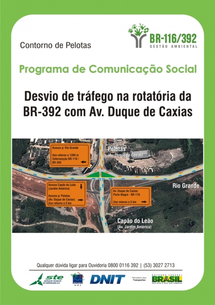 O projeto de duplicação da rodovia no chamado Contorno de Pelotas – trecho que compreende 23,7 km, subdivididos em 15,93 km da BR-116 e 7,77 km da BR-392 – inclui a construção de 14 obras-de-arte especiais. O viaduto do entroncamento com a Avenida Duque de Caxias, localizado no km 66+800 da BR-392, é uma delas. Segundo o Departamento Nacional de Infraestrutura de Transportes (DNIT), para o avanço das obras no local será necessário alterar o tráfego de veículos, a partir desta sexta-feira (09/05).