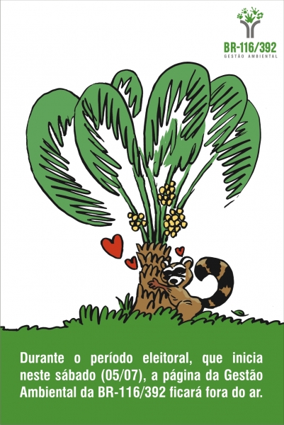Durante o período eleitoral, que inicia neste sábado (05/07) e pode se estender até 26 de outubro – caso haja segundo turno, a página da Gestão Ambiental da BR-116/392 no Facebook ficará fora do ar. A medida vai ao encontro da Instrução Normativa 6/2014, aplicável a órgãos e entidades da administração federal, publicada pela Secretaria de Comunicação Social (Secom) da Presidência da República no Diário Oficial da União, em março.