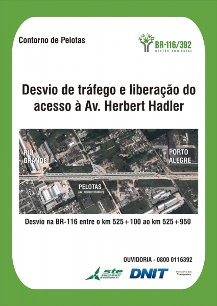 Devido ao avanço das obras no viaduto localizado na intersecção da BR-116 com a Avenida Herbert Hadler, no Contorno de Pelotas, o fluxo principal de veículos será desviado, a partir das 11h deste sábado (06/09), para a rua lateral. De acordo com o Departamento Nacional de Infraestrutura de Transportes (DNIT), a intervenção se estenderá do quilômetro 525,100 ao 525,950 por cerca de seis meses.