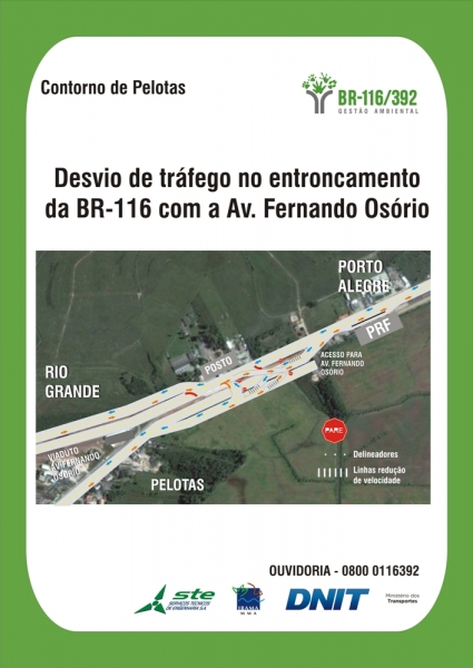 O entroncamento da BR-116 com a Avenida Fernando Osório, um dos acessos à cidade de Pelotas, deverá ser alterado a partir desta segunda-feira (20/10) para o início das fundações do viaduto localizado no quilômetro 517,64, previsto nas obras de duplicação da rodovia. Os movimentos existentes serão mantidos, mas com o tráfego desviado. O Departamento Nacional de Infraestrutura de Transportes (DNIT) orienta os motoristas a redobrarem a atenção para as placas de sinalização. A intervenção deve durar por oito meses.