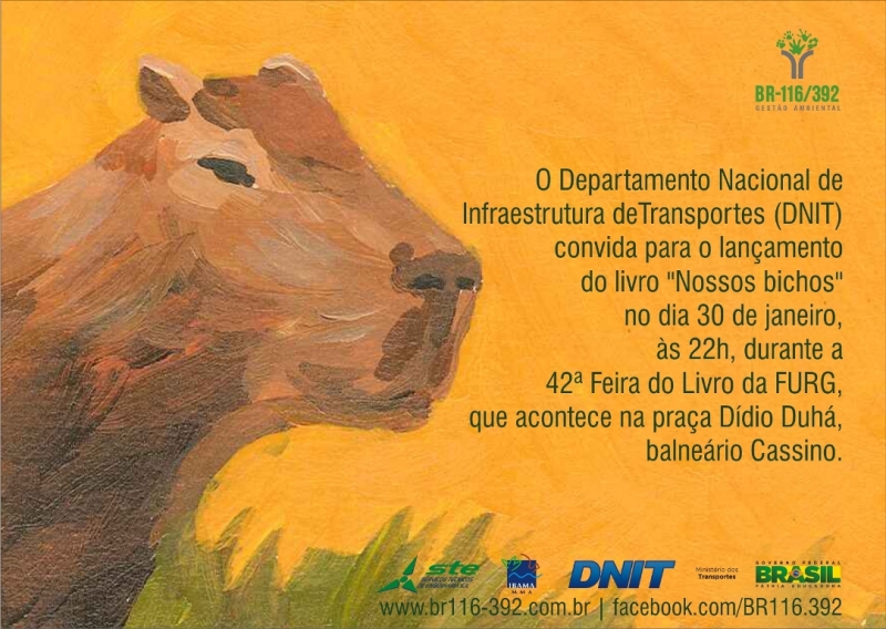 A autarquia também estará presente no Espaço Literário entre os cem autores autografantes. No dia 30, às 22h, ocorre o lançamento do livro “Nossos bichos: guia dos animais da região de Pelotas e Rio Grande – RS”. A obra apresenta registros de mamíferos, aves, répteis, anfíbios e peixes anuais identificados a partir do Programa de Monitoramento de Fauna desenvolvido no decorrer da duplicação. Com textos de Angélica Freitas e ilustrações de Odyr Bernardi, o livro será autografado pelos técnicos deste programa.