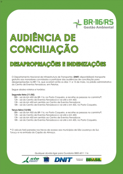Moradores das cidades de Pelotas, São Lourenço do Sul e Turuçu participam, dos dias 11 a 15 de maio, do quinto mutirão de conciliação para tratar dos processos de desapropriação para duplicação da BR-116. As conciliações são promovidas a partir da parceira da Justiça Federal do Rio Grande do Sul (JFRS), Advocacia Geral da União (AGU), Defensoria Pública da União (DPU) e Departamento Nacional de Infraestrutura de Transportes (DNIT) e tem como objetivo a composição amigável das ações, permitindo que os proprietários sejam indenizados mais rapidamente e que a duplicação avance. O mutirão acontece das 9h às 12h e das 14h às 18h, no auditório da administração do Centro de Eventos Fenadoce, em Pelotas.